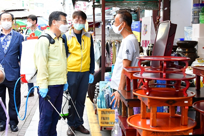 | 류경기 중랑구청장이 시장을 돌며 방역활동을 진행했다(중랑구 제공).© 뉴스1 |