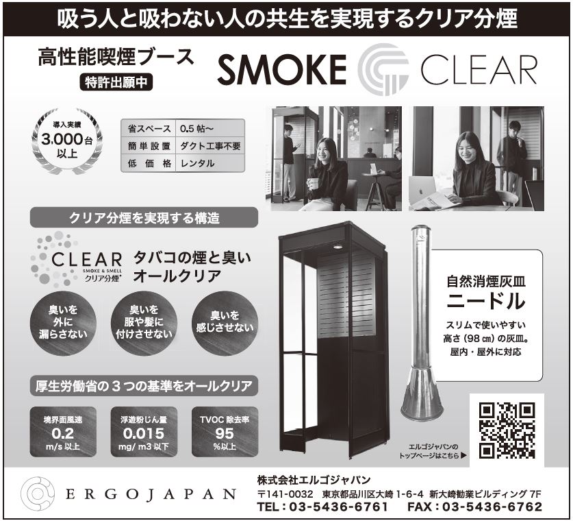 エルゴジャパン(東京都品川区)が開発した高性能喫煙ブース「SMOKE CLEAR(スモーククリア)」は、飲食店を中心に支持を集め、業界最多クラスの3千台以上の導入実績を誇る。