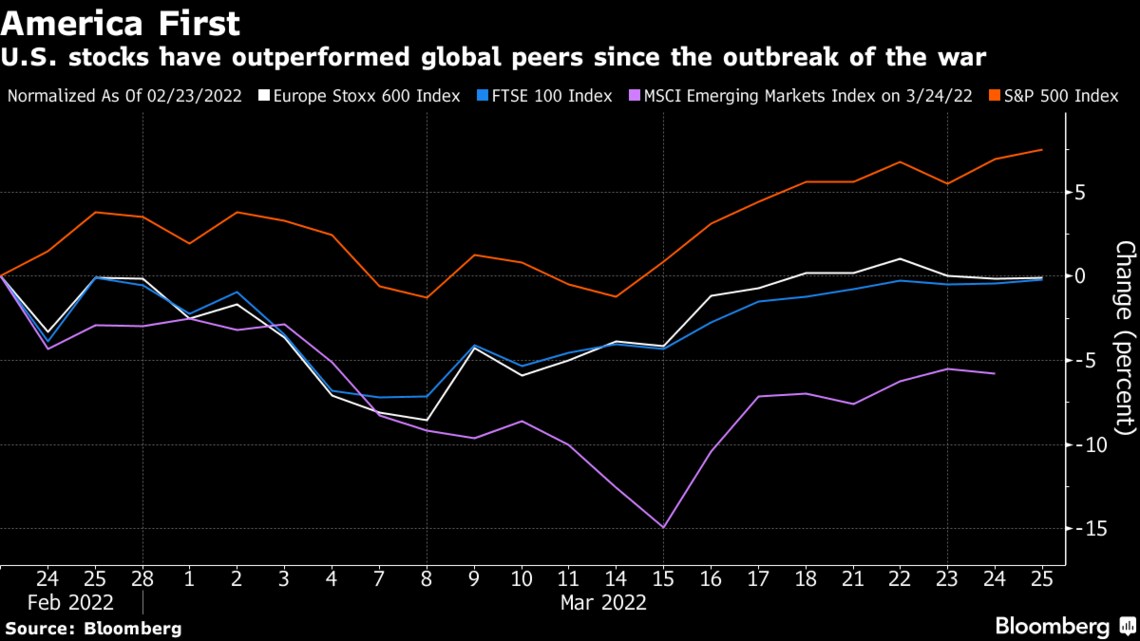 ウクライナでの戦争や金利上昇、世界的なリセッション(景気後退)などリスクが重なる中で、投資家は安全資産の確保を急いでいる。彼らがこれまでに行きついたのは米国株、とりわけ大型株だ。