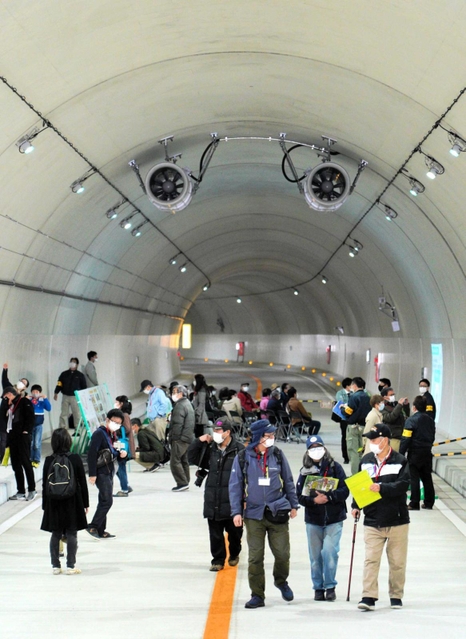 神戸市北区有野町唐櫃の兵庫県道神戸三田線(有馬街道)に新設された有馬口トンネルで20日、完成を記念する式典があった。30日の開通を前に周辺住民約350人がトンネル内を歩いて見学し、近隣の渋滞解消などに期待を寄せた。