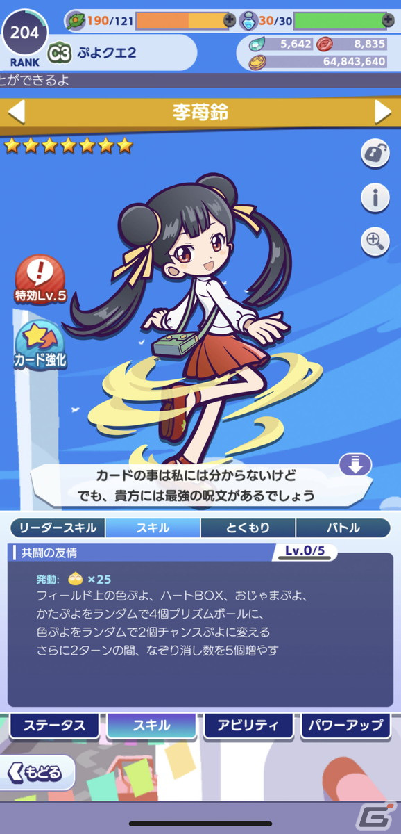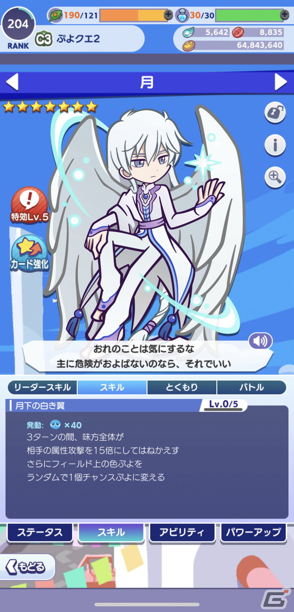 効果:2ターンの間、このカードの通常攻撃をどの色の連鎖でも攻撃するようにし、色ぷよを消したときに発生する数値を9.5倍にする