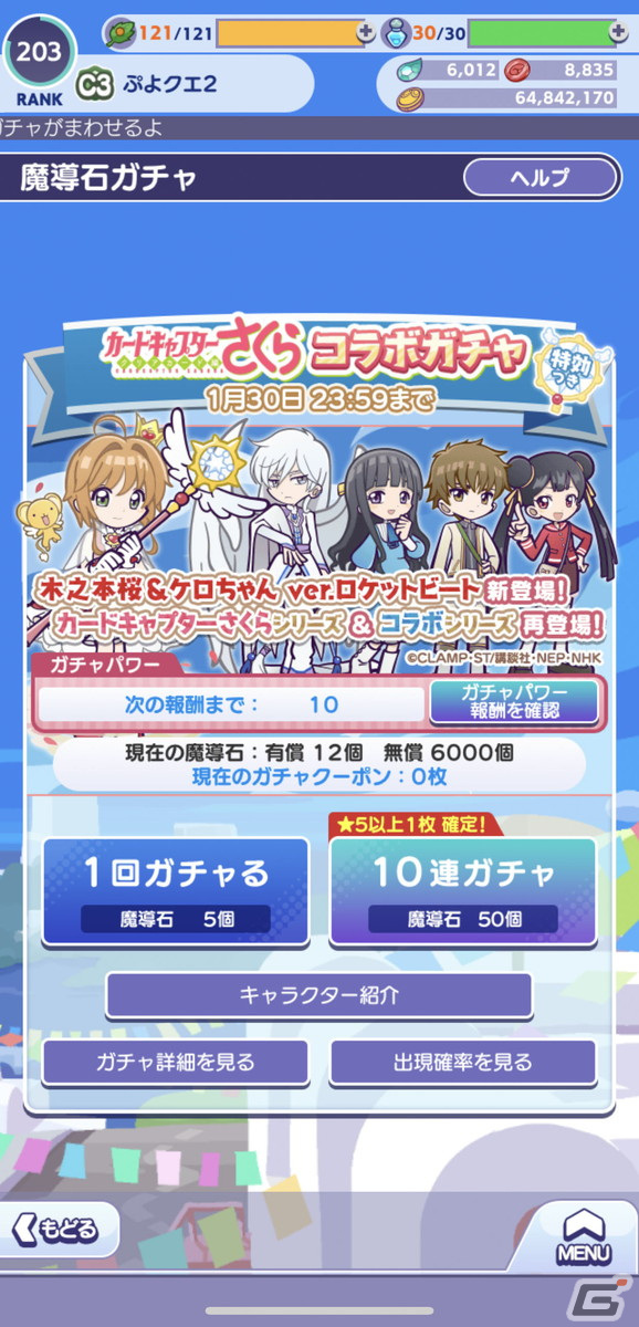 内容:「カードキャプターさくらコラボガチャ」を引くことができる「カードキャプターさくらコラボガチャクーポン」や「魔導石」がもらえるログインボーナスを開催します。毎日ログインして「ぷよクエ」で遊びましょう!