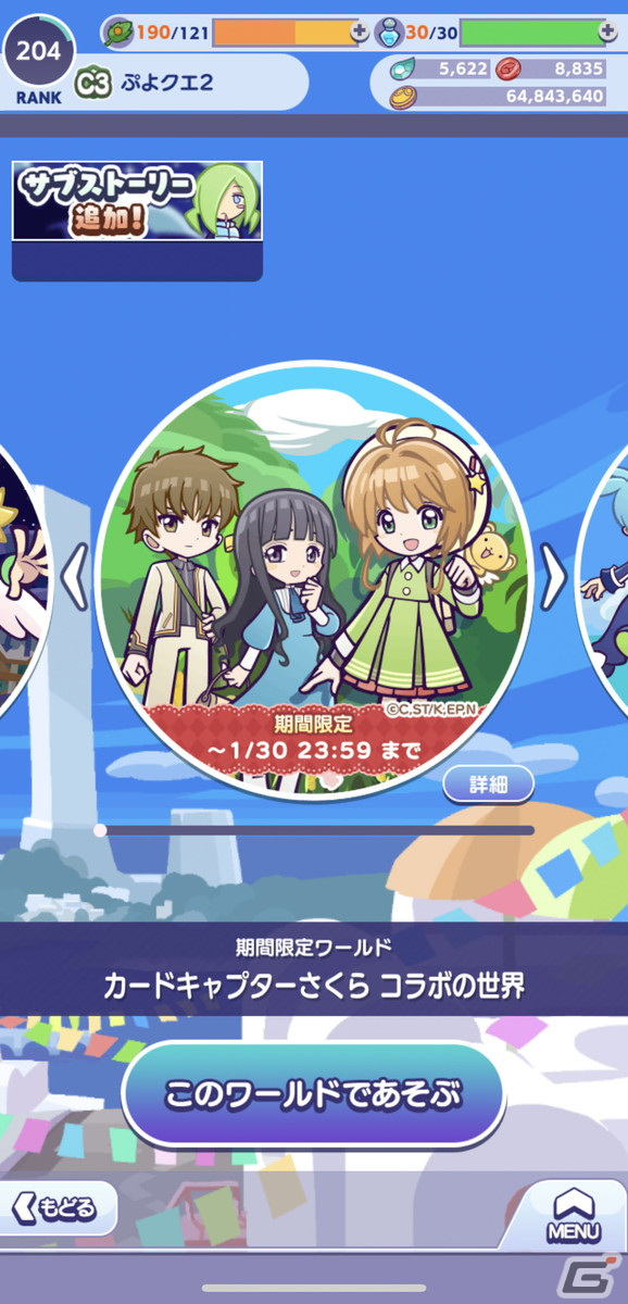 「カードキャプターさくら」のキャラクターたちが登場するコラボ限定の復刻ストーリー「さくらのぷよっと大冒険」を楽しむことができる。いつのまにか知らない世界に迷いこんでしまったさくらとケロちゃんたち一行にどのような出来事が待ち受けているのか、以前見れていなかった人もこの機会にチェックしてみるといいだろう。