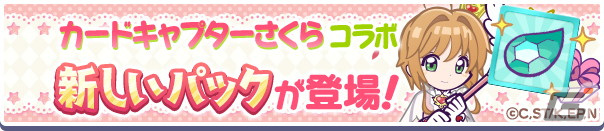 内容:「カードキャプターさくらコラボガチャ」を1枚につき1回引くことがでる「カードキャプターさくらコラボガチャクーポン」が入ったお得な4つの新しいパック「カードキャプターさくらコラボガチャクーポンDXパック」「カードキャプターさくらコラボガチャクーポンスペシャルパック」「カードキャプターさくらコラボガチャクーポンパック」「カードキャプターさくらコラボガチャクーポンミニパック」がショップに登場します。
