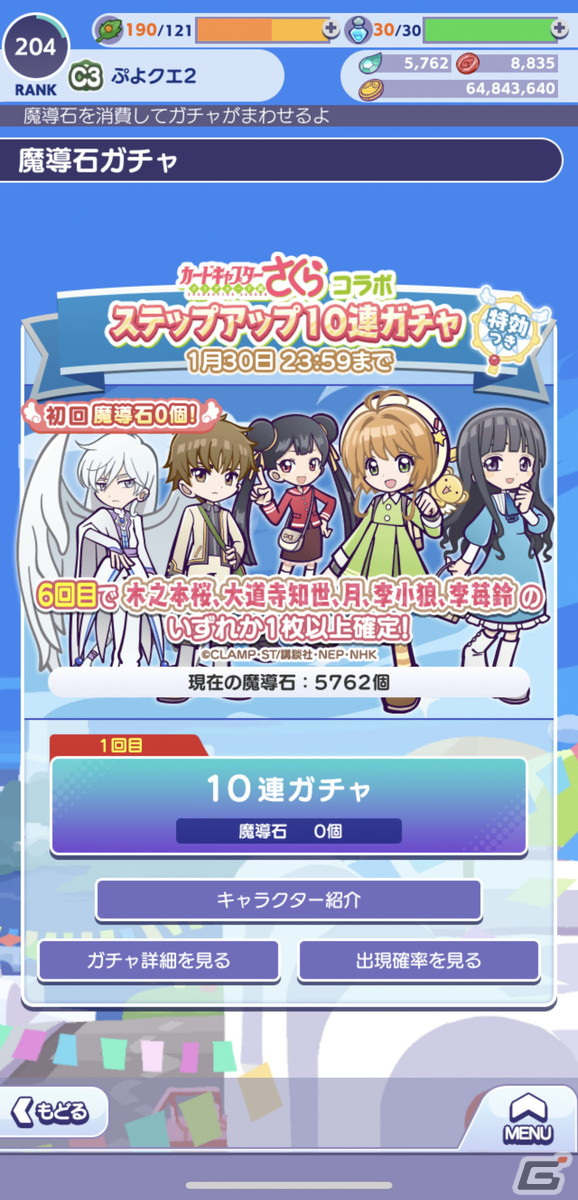 また、「カードキャプターさくら コラボ ステップアップ10連ガチャ」も同時開催。各ステップがお得な回数限定の「10連ガチャ」となっており、通常魔導石50個を消費するところ、「10連ガチャ」の1回目は魔導石0個、2回目は魔導石30個、3回目は40個で、お得にガチャを引くことができる。また、ステップ回数に応じて「カードキャプターさくら シリーズ」「カードキャプターさくら コラボシリーズ」の対象キャラクターいずれかが1枚以上必ず出現するので、こちらも活用しよう。