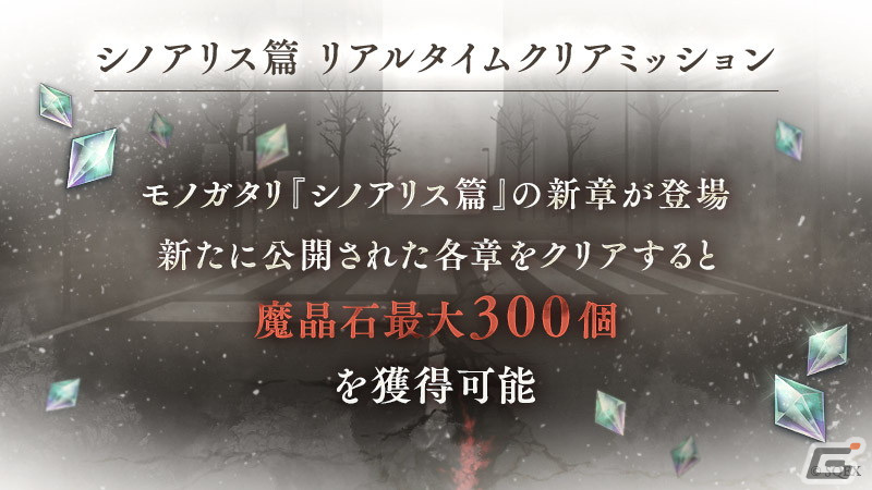 シノアリス篇リリースを記念して、「魔晶石100個」が獲得できるログインボーナスを実施します。さらに、今回公開された「シノアリス篇新章」を期間内にクリアすることで、「魔晶石最大300個」を獲得できるミッションを開催します。
