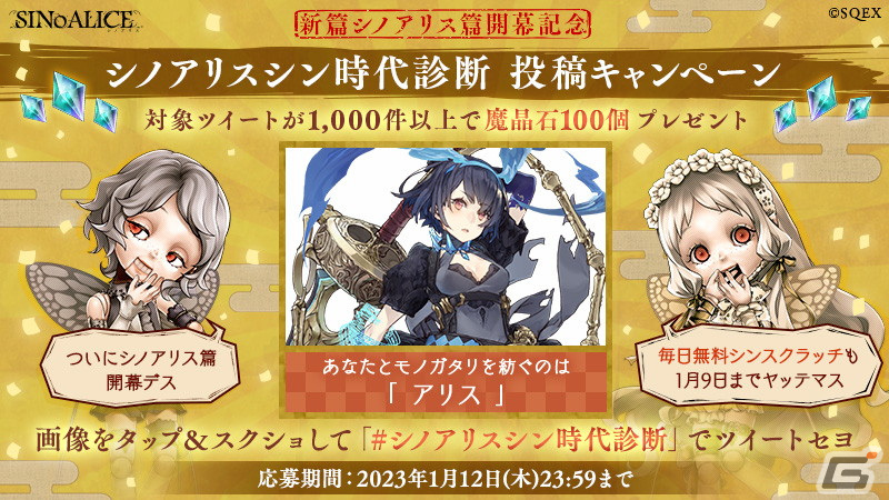 Twitterからの参加で「魔晶石100個」が獲得できる新篇シノアリス篇開幕記念シノアリスシン時代診断 投稿キャンペーンを開始