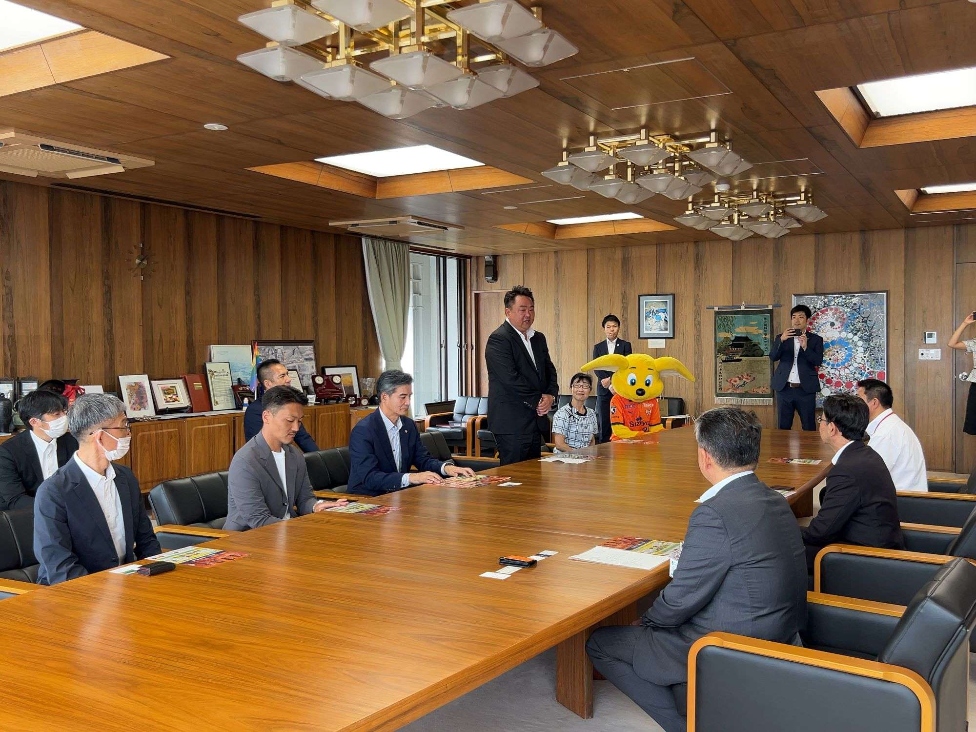 7月13日(木)富士市役所にてクリアファイルの贈呈式を実施し、株式会社エスパルス 代表取締役社長 山室晋也とオフィシャルマスコットのパルちゃんが参加しました。贈呈式にはご協賛いただいた企業の代表者様にもご出席いただき、富士市 森田嘉幸教育長へ贈呈を行いました。