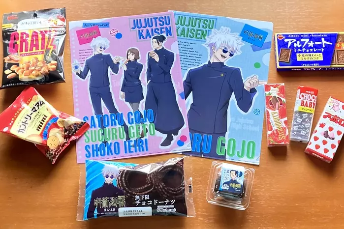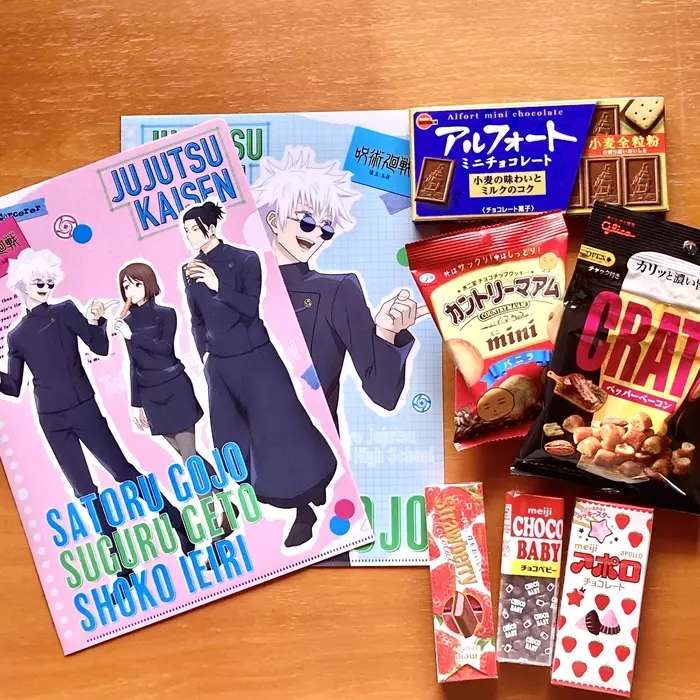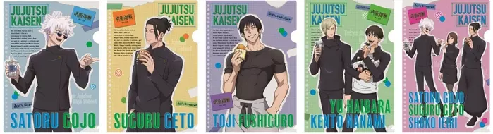 オリジナルの「呪術廻戦」A4クリアファイルは全部で5種類。対象のお菓子を3つ選び、好きな柄のクリアファイルをもってレジに行けばOKです。